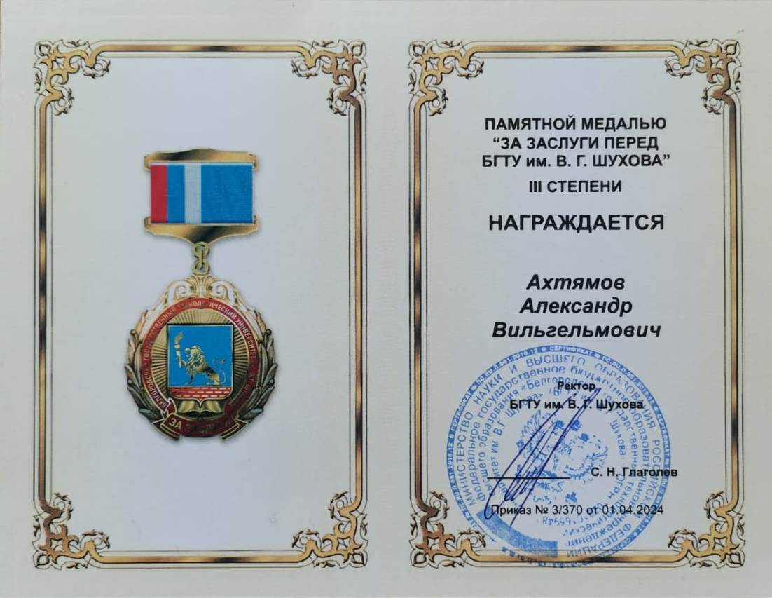 Поздравляем Александра Вильгельмовича Ахтямова с получением почетной награды, медали ˝За заслуги перед БГТУ им.В.Г. Шухова˝.